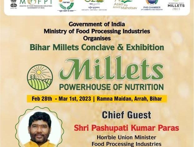 आरा/भोजपुर :- खाद्य प्रसंस्करण उद्योग मंत्रालय, भारत सरकार और पीएचडी चैंबर ऑफ कॉमर्स एंडइंडस्ट्री (PHDCCI) 28 फरवरी और 1 मार्च को रमना मैदान स्टेडियम, आरा, भोजपुर में मिलेट प्रदर्शनी और सम्मेलन का आयोजन कर रहे हैं। बिहार मिलेट प्रदर्शनीऔर सम्मेलन का उद्घाटन केंद्रीय खाद्य प्रसंस्करण उद्योग मंत्री – पशुपति कुमार पारस करेंगे। अन्य आसन्न अतिथियों में विवेक कुमार सिंह – विकास आयुक्त, बिहार और राज कुमार – जिलाधिकारी भोजपुर शामिल हैं।