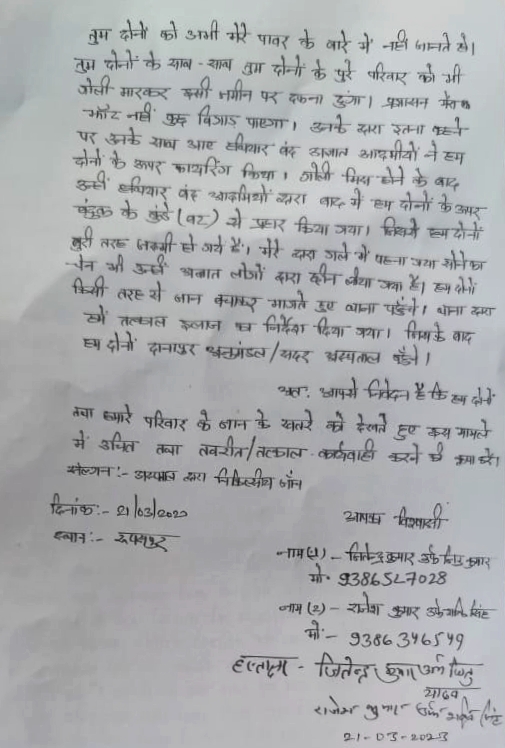इस घटना को लेकर जख्मी जितेंद्र कुमार ने रूपसपुर थाने में सुगौली विधानसभा से आरजेडी के विधायक शशि भूषण सिंह समेत करीब 40 अज्ञात के खिलाफ लिखित शिकायत दर्ज कराई है। दर्ज प्राथमिक में जख्मी जितेंद्र कुमार ने बताया कि महुआ बाग में उसकी जमीन है। जमीन पर सुगौली के विधायक शशि भूषण सिंह अपने 30-40 समर्थकों के साथ पहुंचे और मारपीट करने लगे। इस दौरान गोलीबारी भी की गई। घटना में वो खुद और राजेश कुमार गंभीर रूप से घायल हो गए।