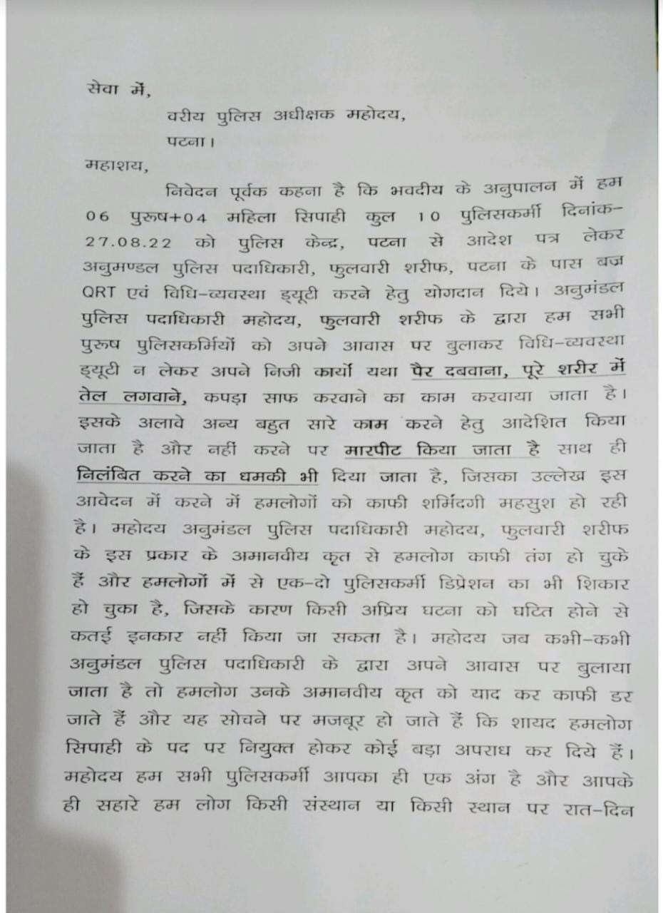 वही, पटना एसएसपी को संबोधित पत्र में लिखा हुआ है कि ‘निवेदन पूर्वक कहना है कि भवदीय के अनुपालन में हम 6 पुरुष और 4 महिला सिपाही कुल 10 पुलिसकर्मी दिनांक- 27.08.22 को पुलिस केन्द्र, पटना से आदेश लेकर पत्र अनुमंडल पुलिस पदाधिकारी, फुलवारी शरीफ, पटना के पास बज्र ORT एवं विधि-व्यवस्था ड्यूटी करने हेतु योगदान दिये। अनुमंडल पुलिस पदाधिकारी महोदय, फुलवारी शरीफ के द्वारा हम सभी पुरुष पुलिसकर्मियों को अपने आवास पर बुलाकर विधि-व्यवस्था ड्यूटी न लेकर अपने निजी कार्यों यथा पैर दबवाना, पूरे शरीर में तेल लगवाने, कपड़ा साफ करवाने का काम करवाया जाता है। इसके अलावे अन्य बहुत सारे काम करने हेतु आदेशित किया जाता है और नहीं करने पर मारपीट किया जाता है। साथ ही निलंबित करने का धमकी भी दिया जाता है, जिसका उल्लेख इस आवेदन में करने में हमलोगों को काफी शर्मिंदगी महशूस हो रही है।’