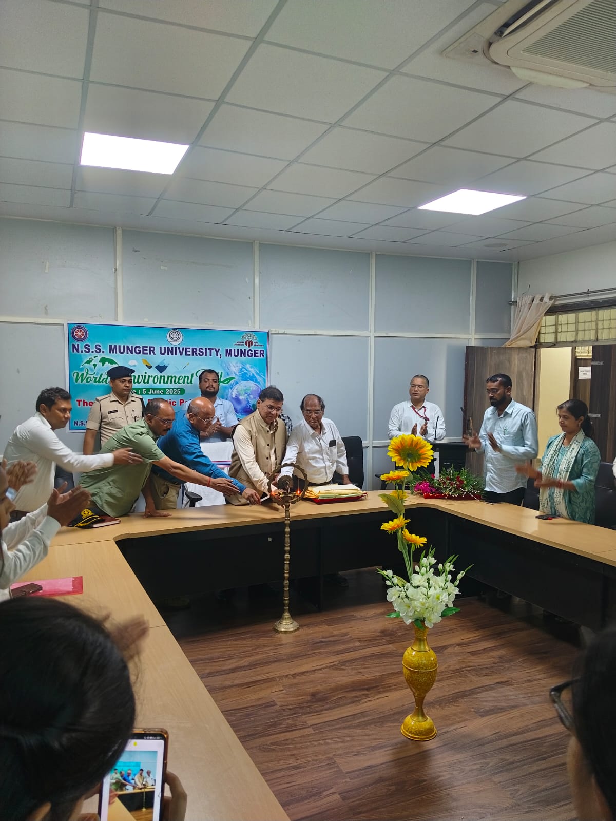 मुंगेर/- मुंगेर विश्वविद्यालय की एनएसएस इकाई और रामधनी भगत डिग्री कॉलेज संग्रामपुर के संयुक्त तत्वावधान में विश्व पर्यावरण दिवस पर पौधारोपण और ‘बीट द प्लास्टिक पॉल्यूशन’ थीम पर जागरूकता कार्यक्रम का आयोजन मुंगेर विश्वविद्यालय के सिंडिकेट हाल में किया गया। कार्यक्रम का प्रारंभ अतिथियों द्वारा दीप प्रज्वलन एवं एनएसएस गान से हुआ। अतिथियों का औपचारिक स्वागत रामधनी भगत डिग्री कॉलेज संग्रामपुर के प्राचार्य डॉ. कुणाल भगत ने किया।