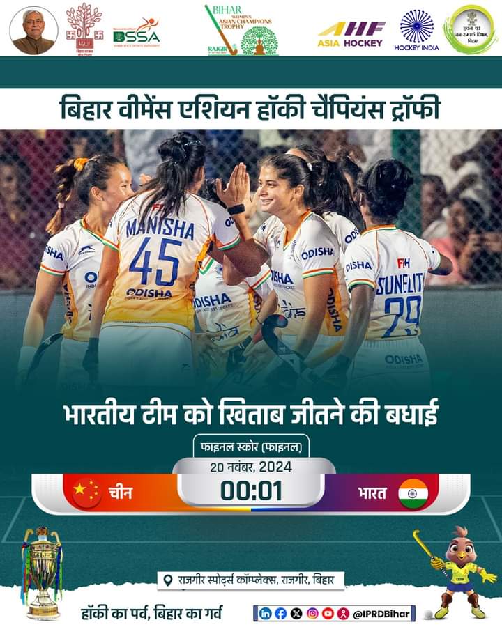 मुख्यमंत्री ने अपने बधाई संदेश में कहा है कि बिहार में पहली बार आयोजित एशियन महिला हॉकी चैंपियनशिप ट्रॉफी में भारत ने फाइनल मुकाबले में चीन पर 1-0 से जीत दर्ज कर इतिहास रच दिया है, जो पूरे देश के लिये गौरव की बात है। इस चैंपियनशिप ट्रॉफी में भारतीय महिला हॉकी टीम ने पूरी एकजुटता और अनुशासन के साथ खेलते हुये इस चैंपियनशिप में भाग ले रही सभी टीमों- मलेशिया, जापान, दक्षिण कोरिया, चीन और थाईलैंड को पराजित किया है।