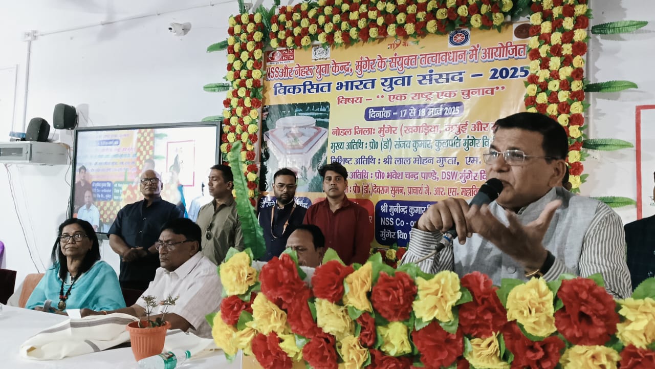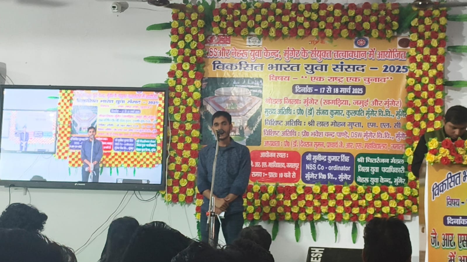 मुंगेर/- मुंगेर विश्वविद्यालय के जेआरएस कॉलेज जमालपुर में एन एस एस इकाई और नेहरू युवा केंद्र मुंगेर के संयुक्त तत्वावधान में ‘ विकसित भारत युवा संसद 2025 ‘ के दो दिवसीय मेगा आयोजन का उद्घाटन एवं युवा संसद कार्यक्रम के रूप में सत्रारंभ किया गया है। कार्यक्रम की अध्यक्षता प्रभारी प्राचार्य प्रो डॉ देवराज सुमन ने की। कार्यक्रम के मुख्य अतिथि मुंगेर विश्वविद्यालय के माननीय कुलपति प्रो संजय कुमार थे, वहीं विशिष्ट अतिथि के रूप में प्रो भावेशचंद्र पांडेय, डी एस डब्ल्यू, मुंगेर विश्वविद्यालय, मुंगेर उपस्थित थे। कार्यक्रम का संयोजक नेहरू युवा केंद्र के जिला युवा अधिकारी श्री चितरंजन मंडल थे एवं आयोजन का संचालन डॉ चन्दन कुमार, एन. एस. एस. पी. ओ, जे. सी. जे. एवं डॉ राजेश कुमार सिंह, एन एस एस पी ओ जे. आर. एस. कॉलेज जमालपुर ने सम्मिलित रूप से किया।
